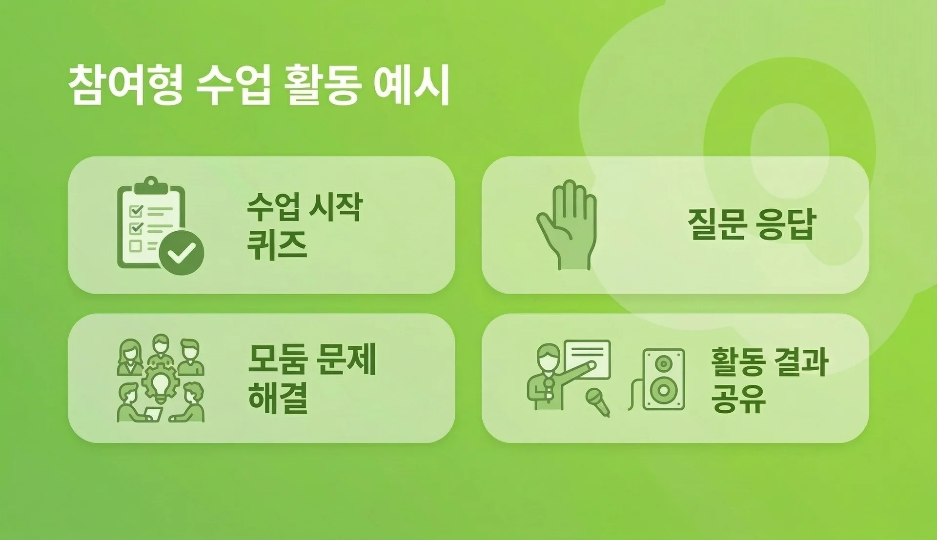 참여형 수업이라고 해서 처음부터 큰 변화를 만들 필요는 없고 수업 시작 퀴즈, 학생 응답 활동, 모둠 문제 해결, 팀 기반 활동, 결과 공유 등과 같은 작은 활동부터 시작해도 학생 참여 분위기는 자연스럽게 만들어집니다.
